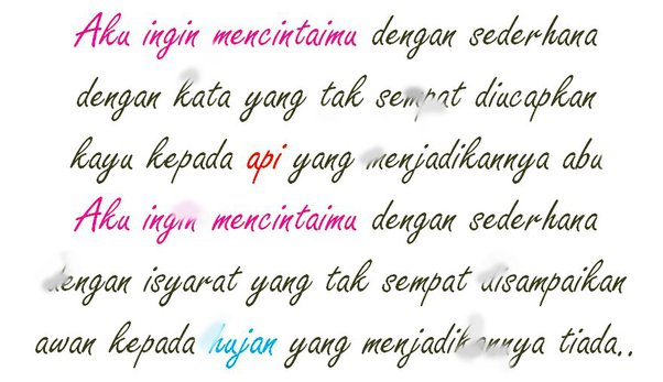 Puisi cinta romantis sejati untuk pacar kekasih yang pendek penuh arti makna yang dalam bikin baper galau nyesek sedih patah hati jatuh cinta lucu terbaik. 3 contoh puisi cinta sejati . Buat kekasih hati maupun gebetan bahkan mantan. Contoh puisi cinta sejati, romantis terbaik yang menyentuh hati, bikin baper dan terbaru. Bisa berupa novel, cerpen, puisi, dan lainnya. Puisi cinta melayu puisi cinta mendalam puisi cinta islami puisi cinta kahlil gibran puisi cinta panjang puisi cinta inggris puisi cinta .